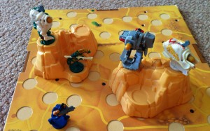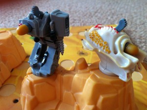 Once unwrapped, however, Impact didn’t really work. The board folded out to provide a ‘battle field’ approximately 90cm by 60cm. On this players arranged plastic blocks representing sand dunes, and on these were arranged the armies of ‘Raptor Scouts’ on one side and ‘Corezec Drill Rig Squad’ on the other. Some aspect of play required you to move your characters around the board, but the main point of the game was for the little plastic models to exchange fire. Each character was fitted with a spring-loaded ejector that, at the flick of a switch, shot a plastic projectile in the direction of one of your opponent’s models.