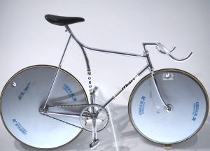 The bicycle on which Eddy Merckx set cycling’s hour record in 1972 is a simple affair, little different from the retro ‘fixies’ favoured today by cycle messengers and hipsters. Indeed, the flat orange of its tubing and spare lines might turn heads in Hoxton. Spotting any connection between Merckx’ bike and contemporaneously raging space race is impossible. Even the sinuously curved frame on which Francesco Moser finally bettered the Belgian’s effort in 1984, is more Art Nouveau than jet age.